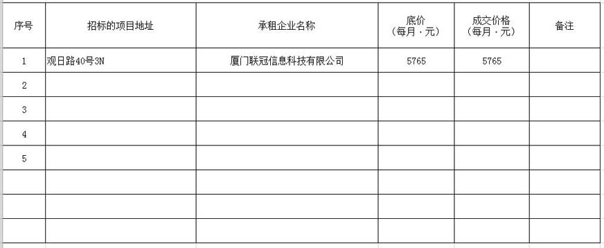 根據(jù)思明區(qū)國有企業(yè)資產(chǎn)出租管理的相關(guān)制度,我司2020年5月8日上午9:00起于觀音山營運(yùn)中心2號樓2層2號會(huì)議室進(jìn)行公開招租現(xiàn)場開標(biāo),現(xiàn)通過思明控股網(wǎng)站對外發(fā)布成交公告,內(nèi)容如下: