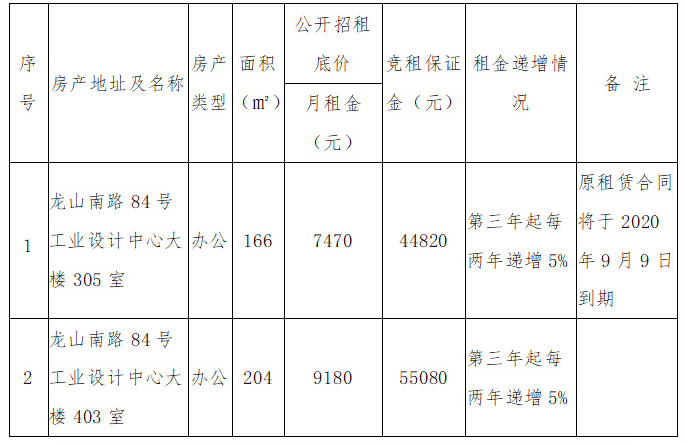 根據(jù)國(guó)有企業(yè)資產(chǎn)出租管理相關(guān)制度,我司決定對(duì)位于思明區(qū)龍山南路84號(hào)工業(yè)設(shè)計(jì)中心305、403單元房產(chǎn)對(duì)符合入駐條件的意向承租人進(jìn)行公開(kāi)競(jìng)價(jià)招租,具體信息如下: