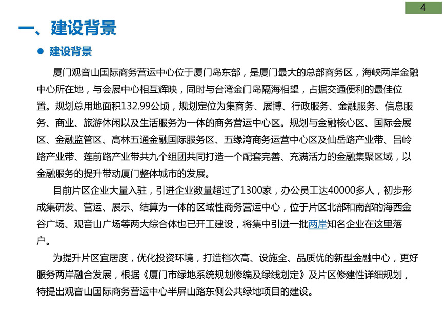 觀音山片區(qū)作為兩岸金融中心片區(qū)重要組成部分,公共綠地建設、養(yǎng)護水平的高低關系到兩岸金融中心建設的品質。為提升片區(qū)景觀形象,優(yōu)化投資環(huán)境,根據《廈門市綠地系統(tǒng)規(guī)劃修編及綠線劃定》及片區(qū)修建性詳細規(guī)劃,廈門市開元國有投資集團有限公司擬建設觀音山國際商務營運中心半屏山路東側公共綠地項目,并委托上海東方設計研究院進行了方案設計。根據廈府辦[2019]115號文要求,現將設計方案予以公布并廣泛征求意見。
