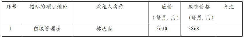 根據(jù)國有企業(yè)資產(chǎn)出租管理相關(guān)制度,我司于2020年10月26日上午10:30在廈門文創(chuàng)展示中心A9棟一層會議室進行思明區(qū)環(huán)島路6個站點管理房分別公開招租現(xiàn)場開標,現(xiàn)通過現(xiàn)場租賃物對外發(fā)布成交公示,內(nèi)容如下: