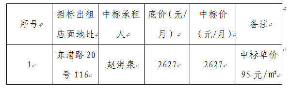 根據(jù)思明區(qū)國(guó)有企業(yè)資產(chǎn)出租管理的相關(guān)制度,我公司于2020年12月18日10:00在廈門市禾祥西路51號(hào)10A中山房地產(chǎn)公司會(huì)議室,進(jìn)行浦南安置小區(qū)東浦路20號(hào)103等13間店面公開(kāi)招租現(xiàn)場(chǎng)開(kāi)標(biāo)。僅一間店面成交,其余12間店面因無(wú)人應(yīng)標(biāo)而流標(biāo)?,F(xiàn)通過(guò)思明控股網(wǎng)站對(duì)外發(fā)布成交公告,內(nèi)容如下: